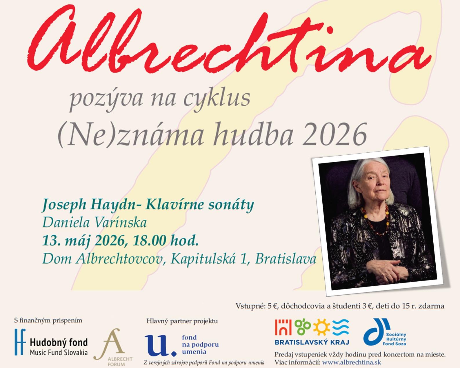 Srdečne Vás pozývame na štvrtý koncert (Ne)známej hudby v roku 2026, ktorý sa koná pri príležitosti krásneho životného jubilea klaviristky Daniely Varínskej. Na koncerte budú znieť v jej podaní klavírne sonáty rakúskeho skladateľa, rodáka z neďalekého Rohrau, Josepha Haydna (1732 […]