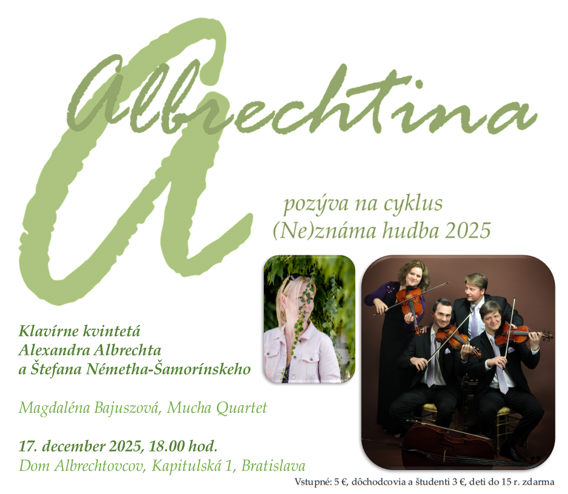 Srdečne Vás v mene o.z. Albrechtina pozývame na posledný tohtoročný koncert (Ne)známej hudby! PROGRAM: Alexander Albrecht (1885-1958): Klavírne kvinteto Štefan Németh-Šamorínsky (1896-1975): Klavírne kvinteto, op. 52 Alexander Albrecht i Štefan Németh-Šamorínsky študovali u Bélu Bartóka a patria k významným predstaviteľom […]
